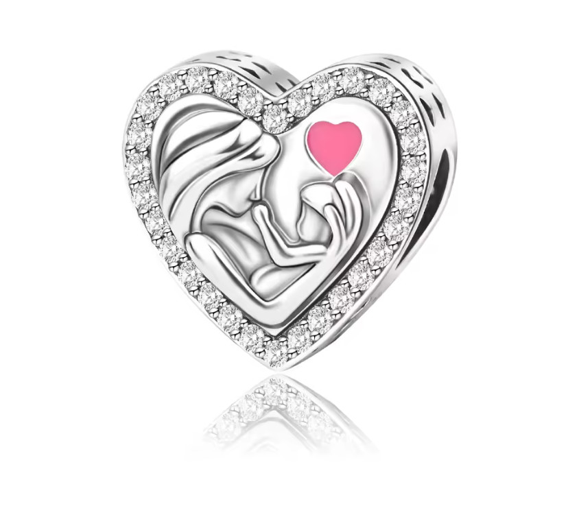 Ez a csodás charm az anya és gyermeke közötti szeretet örök kötelékét ragadja meg. A szív alakú ezüst medál közepén részletgazdag anya-gyermek ábrázolás látható, amelyet egy finom rózsaszín szív tesz még meghittebbé.