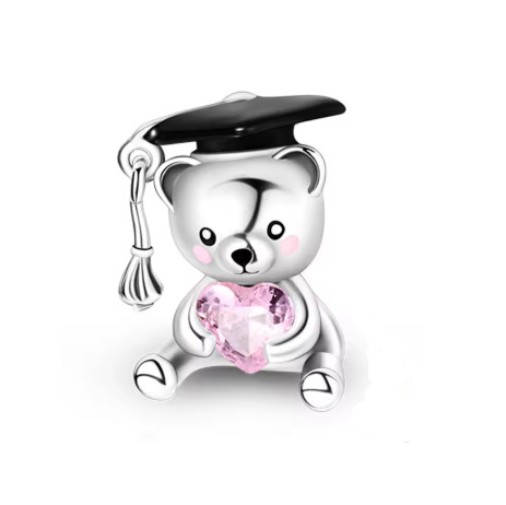 Ballagási maci charm diploma sapkával és rózsaszín szív kristállyal – ezüst