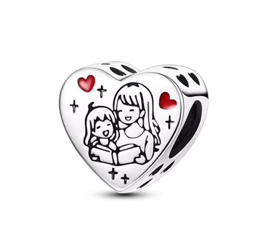 Ez az ezüst szív charm az anyai szeretet egyik legszebb szimbóluma. Az előlapon egy mosolygó anya és gyermeke látható, körülöttük apró piros szívekkel, amelyek a gondoskodást és az érzelmi kötődést jelképezik.