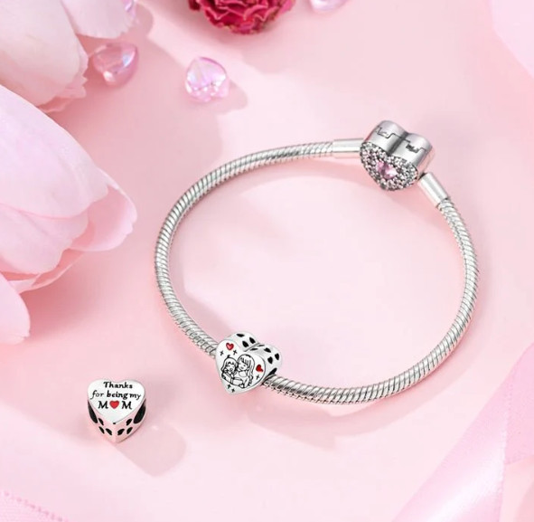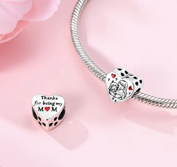 A hátoldalon olvasható „Thanks for being my mom” felirat különösen személyessé teszi a charmot, így nemcsak ékszer, hanem egy szívből jövő üzenet is.