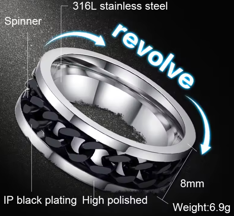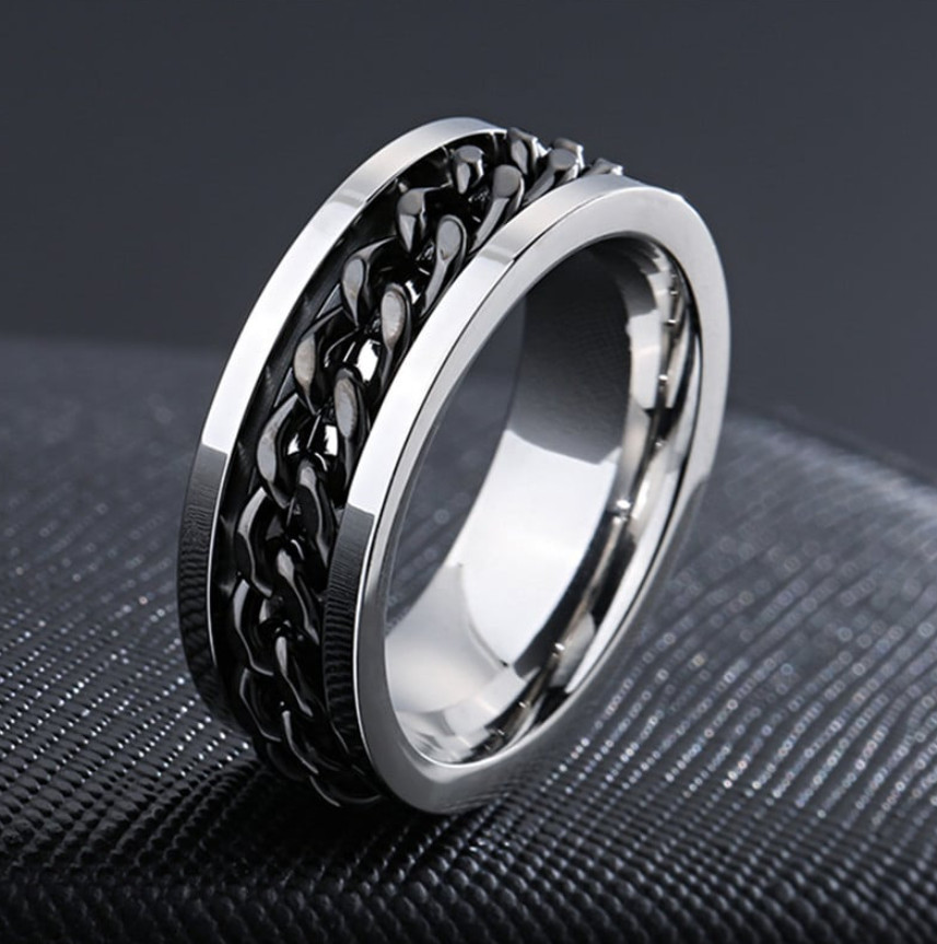 Ezüst - fekete láncmintás stresszoldó "fidget" nemesacél gyűrű