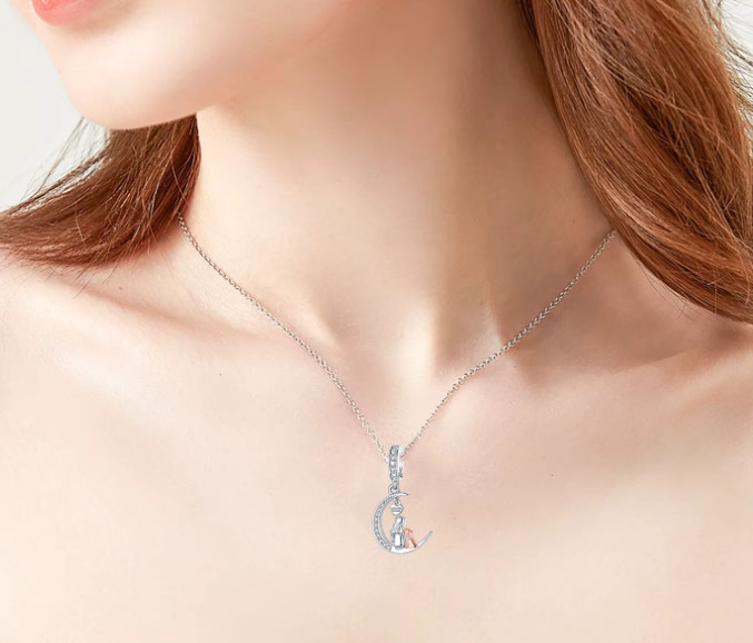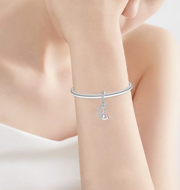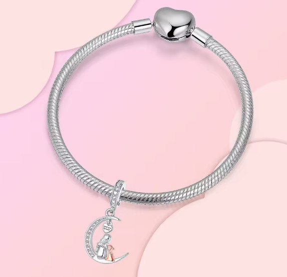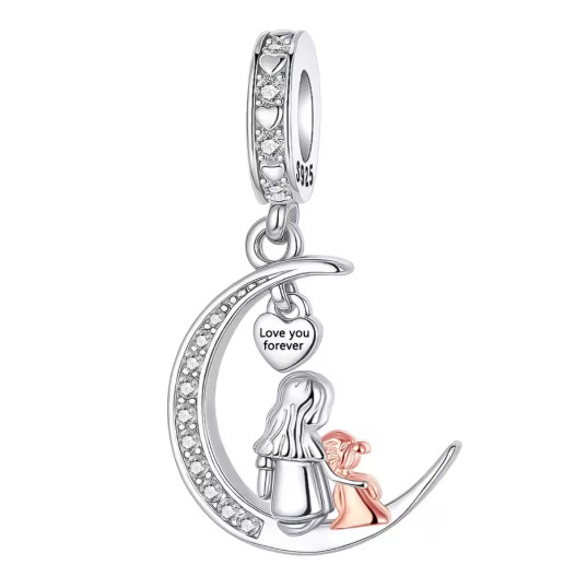 Ez a különleges függő charm egy finoman ívelt félholdon ülő anya–gyermek párost ábrázol, amely az oltalmazó szeretet és az összetartozás jelképe. A charmot apró cirkóniák díszítik, a kis szív alakú medálon pedig a „Love you forever” felirat teszi még személyesebbé az üzenetet.