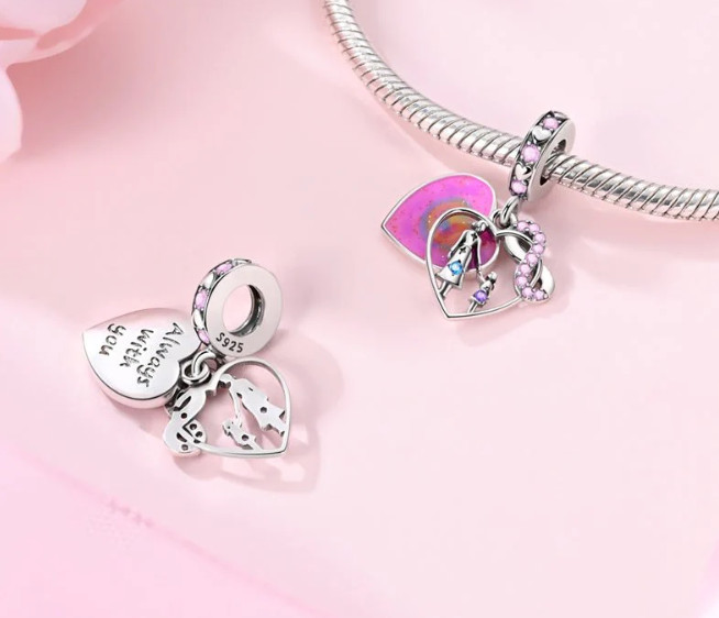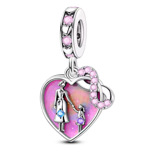 Ez a különleges ezüst szív charm egy anya és gyermeke bensőséges kapcsolatát ábrázolja: kézen fogva, egymás felé fordulva, a szív közepén. A háttér rózsaszín, színjátszó hatású zománccal készült, amely gyönyörűen változtatja árnyalatait a fényben.