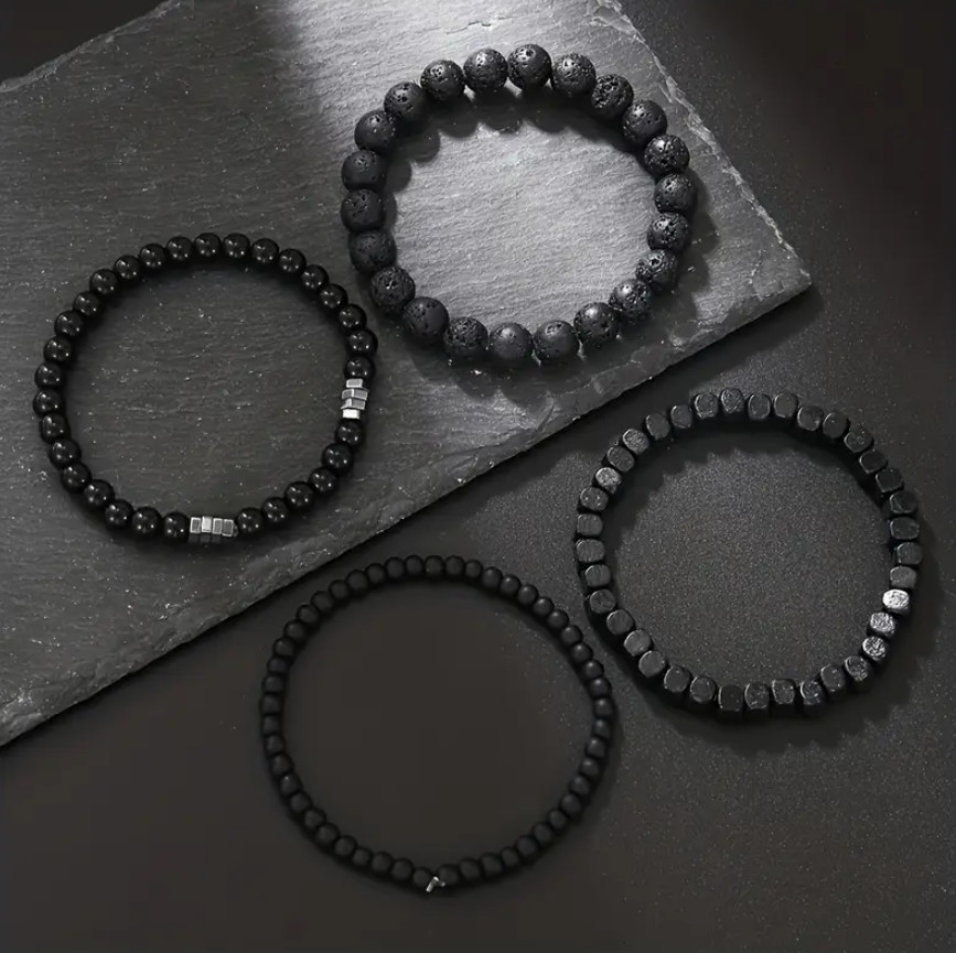 Ez a 4 részes fekete férfi karkötő szett különböző stílusú gyöngy karkötőkből áll, melyek együtt és külön-külön is hordhatók.
