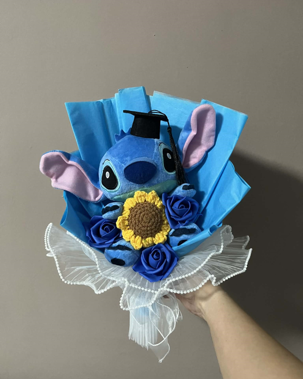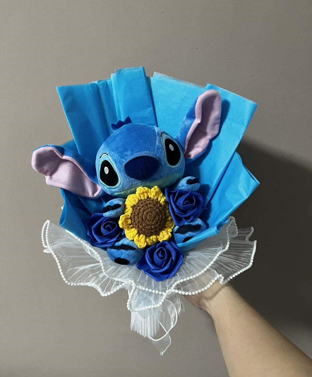 Ez a Stitch plüss csokor a napraforgó vidám, meleg hangulatát ötvözi a sötétkék virágok elegánsabb karakterével, ezért igazán egyedi összhatást kelt. A kék Stitch figura, a sötétebb díszítés és a napraforgós részletek együtt nagyon mutatóssá teszik, így kézben átadva és fotókon is kiemelkedően látványos ajándékcsokor.