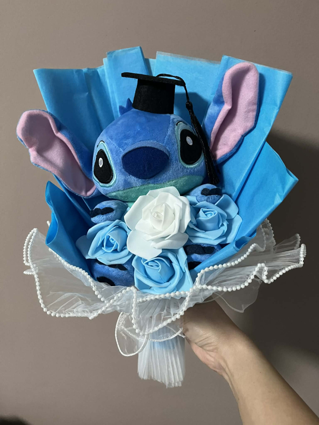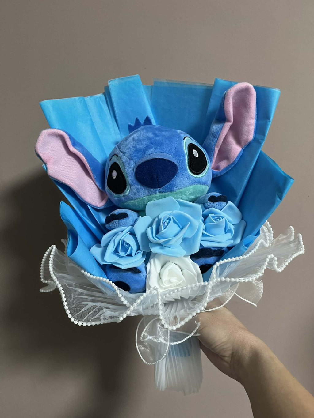 Ez a Stitch plüss csokor a világoskék és fehér virágdíszítéssel tiszta, könnyed és ünnepi összhatást kelt. A kék Stitch figura körül a világos árnyalatok lágy, harmonikus csokorhatást adnak, így az ajándék egyszerre lesz dekoratív, kedves és nagyon mutatós.